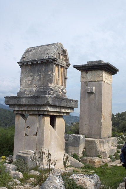 ![]() Pillar tombs at Xanthos ("Harpy Tomb" on the right). On the left is a completely unique tomb in Lycia, actually two-tombs-in-one - a normal Lycian sarcophagus stands upon a shorter-than-usual pillar tomb. It is quite tall, only slightly shorter than the Harpy Tomb. The date of this tomb is disputed, some sources say 4th century BC, other 3rd. |